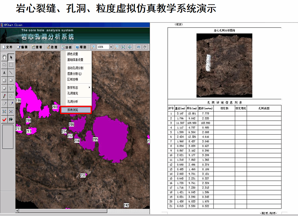 傳統(tǒng)實(shí)驗(yàn)由老師手持巖心實(shí)物、指導(dǎo)學(xué)生觀(guān)察、描述巖心。由于巖心實(shí)物匱乏,教學(xué)素材極其有限。通過(guò)虛擬仿真技術(shù),可以通過(guò)各大油田巖心庫(kù)收集國(guó)內(nèi)外巖心實(shí)物的數(shù)字圖像,結(jié)合計(jì)算機(jī)技術(shù)實(shí)現(xiàn)巖心孔洞、裂縫、粒度虛的擬仿真教學(xué)。通過(guò)數(shù)字圖像處理技術(shù)對(duì)巖心圖像進(jìn)行預(yù)處理,快速確定裂縫的邊界,達(dá)到巖心圖像處理和人機(jī)交互方式。研究巖心孔洞、裂縫、粒度圖像分析技術(shù),實(shí)現(xiàn)了自動(dòng)提取孔洞、裂縫、粒度目標(biāo),自動(dòng)統(tǒng)計(jì)計(jì)算相關(guān)參數(shù),并結(jié)合試驗(yàn)室常規(guī)物性測(cè)試和測(cè)井資料進(jìn)行參數(shù)分析評(píng)價(jià),從而解決了以往人工測(cè)定,測(cè)量數(shù)值存在較大誤差,而且費(fèi)工費(fèi)時(shí),轉(zhuǎn)化參數(shù)難度大等問(wèn)題,深化了對(duì)巖心這一地質(zhì)基礎(chǔ)資料的應(yīng)用,對(duì)于裂縫、孔洞型油氣藏的勘探與開(kāi)發(fā)具有重要意義。